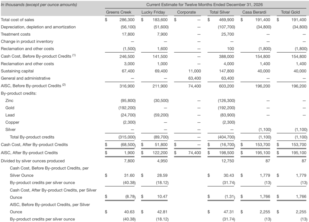 - At Lucky Friday, guidance for total cost of sales (includes depreciation) is $184 million, an increase over the prior year largely reflecting the expected impact of higher profit-sharing payments driven by the elevated silver price. Cash cost guidance is $10.25-$11.00 (after by-product credits), per silver ounce, and AISC at $23.50-$26.00 (after by-product credits), per silver ounce.1,2