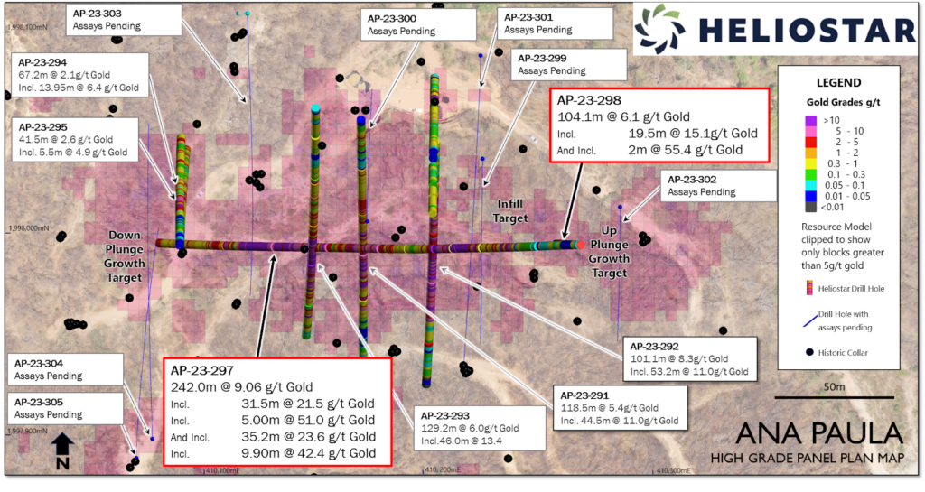 Heliostar CEO, Charles Funk, commented, “Hole AP-23-297, 242m grading 9.06 g/t gold, is an incredible gold intercept that exceeded our expectations. It shows potential to add ounces at higher grade in the up-plunge growth target. And it illustrates the excellent continuity of high grade along the length of the High Grade Panel. Holes AP-23-297 and AP-23-298 are both respectively 33% and 38% increases relative to the current resource model prediction, at a >5 g/t gold cut-off grade. Heliostar is well placed with a recently strengthened cash balance, continued flow of infill and growth drilling results and impactful metallurgical and geotechnical studies pending. The Company continues to tick off the catalysts to deliver the updated resource and re-scope of Ana Paula in 2023.”