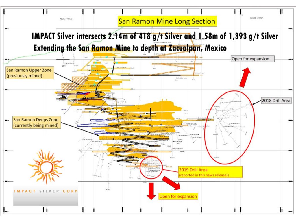 IMPACT Silver Corp. (“IMPACT” or the “Company”) is pleased to announce high-grade silver results from underground drilling which have extended the mineralization 50m to depth at the San Ramon Mine in the Royal Mines of Zacualpan District, central Mexico. The zone remains open to depth and along strike for further extension. Results from these new drill holes are as follows: