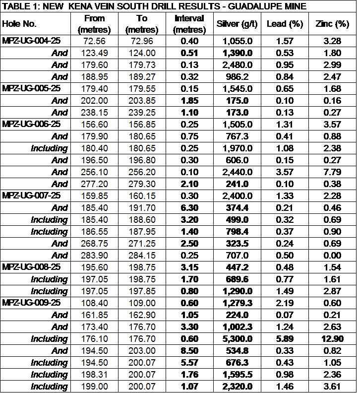 Underground drilling from Level 140 of the Guadalupe Mine intersected further significant mineralization on the recently discovered Kena Vein South extending the zone to the north and discovered other nearby parallel and splay high-grade veins. New assays received include the following:
