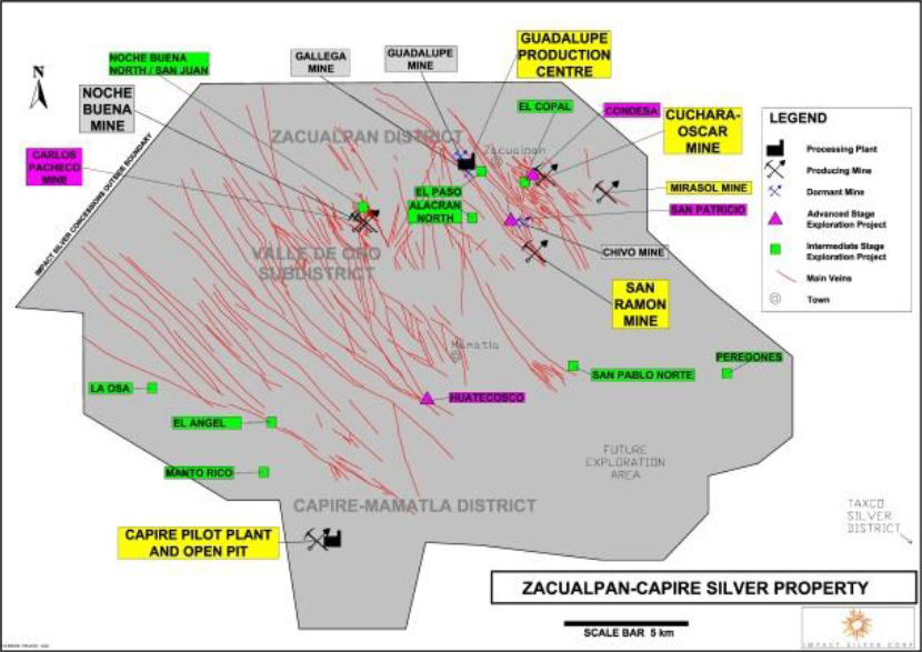 IMPACT Silver Corp. is a successful silver explorer-producer with two processing plants on adjacent districts within its 100% owned large land package in central Mexico with excellent infrastructure and labor force. During the past thirteen years IMPACT has produced over 9.4 Moz of Silver generating revenues of $175 million, with no long-term debt. In the historic Royal Mines of Zacualpan Silver District three underground silver mines feed the central 535 TPD Guadalupe processing plant.
