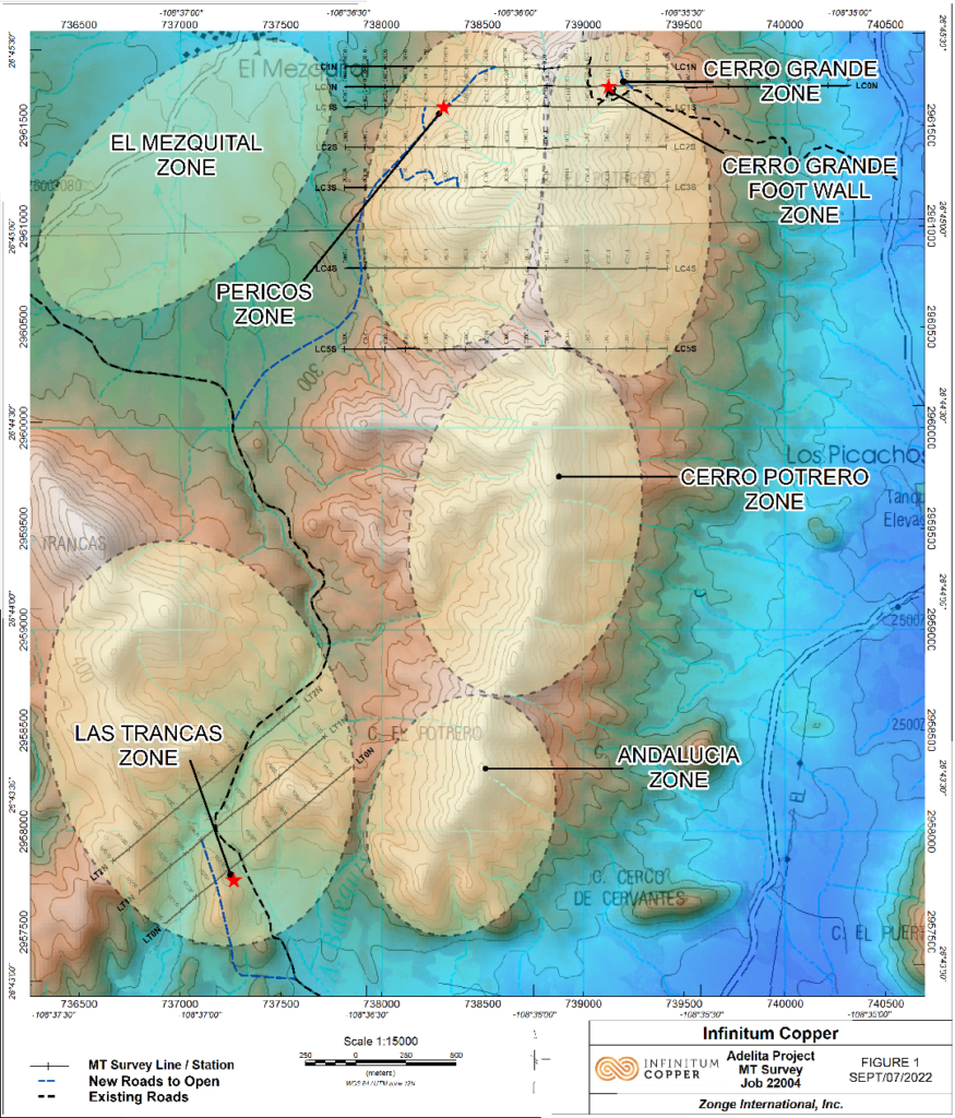 VANCOUVER, BC / ACCESSWIRE / September 7, 2022 / Infinitum Copper Corp. (TSXV:INFI)(OTCQB:INUMF) (“Infinitum” or the “Company“) is pleased to announce completion of the first phase of the current exploration program at its flagship La Adelita project in Sonora and Sinaloa States, Mexico. Exploration activities in 2022 have resulted in the discovery of three significant showings, including a previously announced trench at Las Trancas zone that returned 9.15 metres (m) of 16.45 grams per tonne (g/t) gold, 1.90% copper and 3.50 g/t silver (see Figure 1 and News Release April 13, 2022). The current geophysical interpretation has revealed several strongly anomalous results which will be the focus of the next phase of diamond drilling.