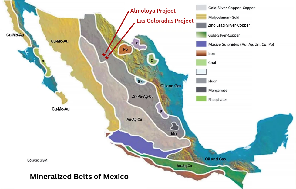 Kingsmen Resources is a discovery-driven explorer focused on unlocking the potential of two 100%-owned precious-metal districts Las Coloradas and Almoloya located in the historic Parral region of Chihuahua, Mexico, one of the most productive silver belts in the world. Both projects cover past-producing high-grade silver and gold mines and lie directly on the structural corridors that host many of Mexico’s most notable silver-gold deposits. Recent drilling at Las Coloradas has confirmed new zones of shallow, high-grade mineralization and highlighted the potential for multiple parallel structures across an 4.5-kilometre trend. At Almoloya, historic drilling, extensive underground workings, and multiple vein systems point to strong potential for both vein-hosted and carbonate-replacement style mineralization. Kingsmen also owns a 1% NSR royalty on the La Trini claims within GoGold Resources’ Los Ricos North project in Jalisco State, Mexico.