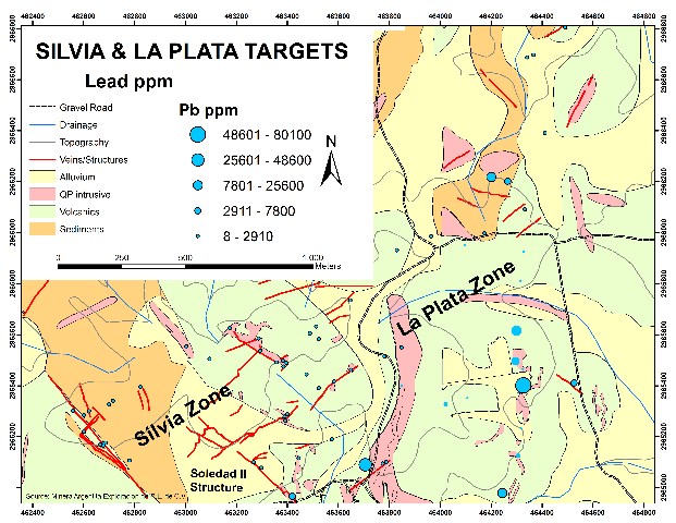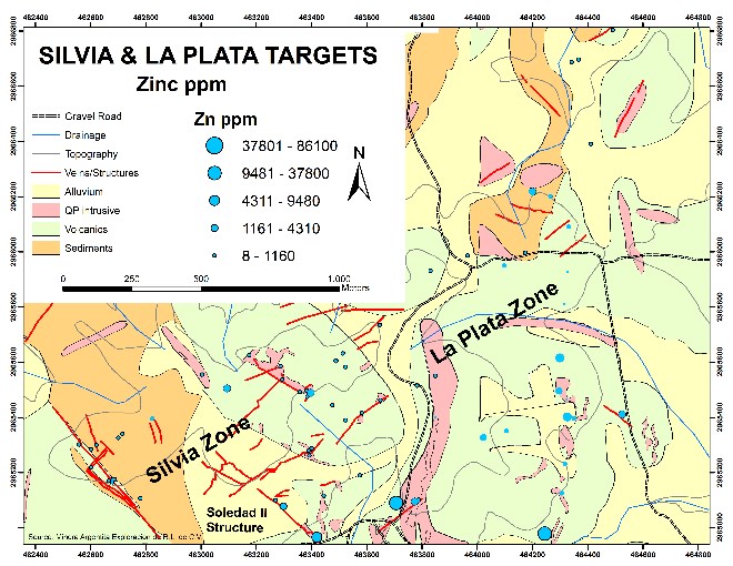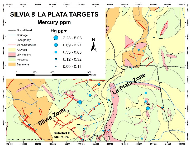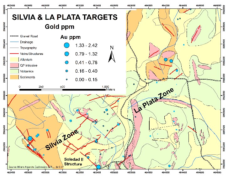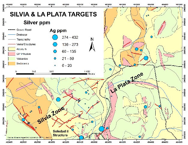 The Silvia and La Plata zones are located on the 2,500 meter-long, NE-trending zone of structures that lies to the north of the NW-trending Soledad/Soledad II structures/vein systems. The Silvia zone is located at the intersection of the Silvia-La Plata zones and the Soledad structures/vein systems. The La Plata zone contains NE, NW and N-trending structures/veins. N-trending structures/vein systems are unusual and may, in part, be reflecting buried quartz porphyry (QP) intrusives.