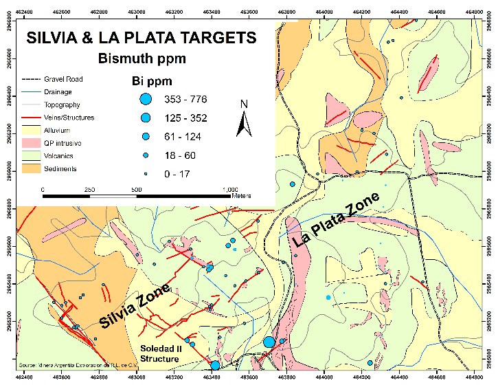 The Company completed a review of the geochemistry of samples collected from the Silvia and La Plata zones to ensure maximum value is extracted from the geochemical data base in defining exploration +/- drill targets. A number of pathfinder elements vary significantly with silver. These variations are interpreted to indicate different pulses of mineralization and possibly indications of different styles of mineralization along and at depth in the two structures.