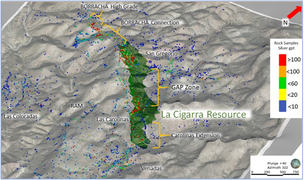 The La Cigarra Property is approximately 18,000 hectares and covers the northern 20-kilometer portion of a 40+ kilometer mineralized trend which has produced over half a billion ounces of silver in the San Francisco Del Oro and Santa Barbara mining district that in 2016 reported an estimated reserve of 200 million ounces of silver.