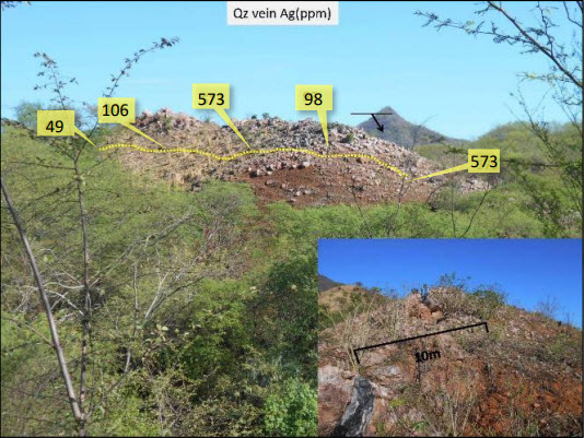 - 7.2 gpt gold and 3,770 gpt silver in grab samples taken at the 5 Senores and Agua Veins, respectively;