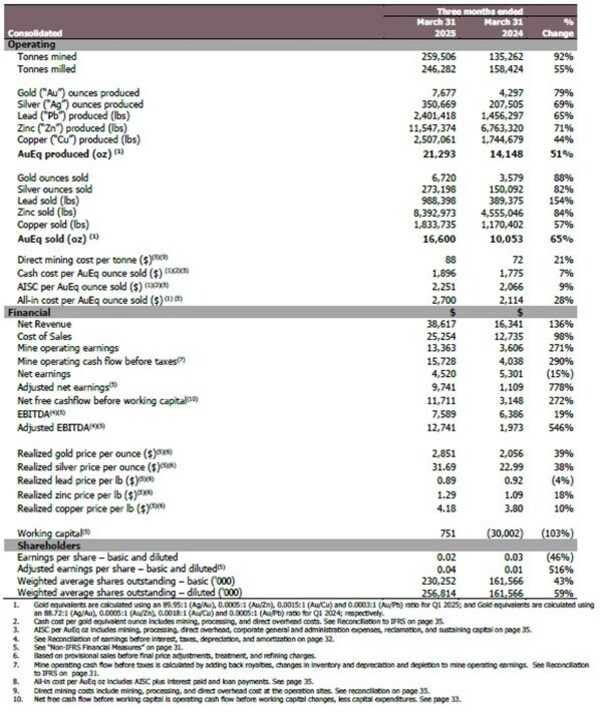 • In health and safety, the Company reported a TRIFR (total recordable injuries frequency rate) of 0.87, improvement over the prior year and achieved 1,000,000 hours of no lost time incidents at Campo Morado in the first quarter of 2025.