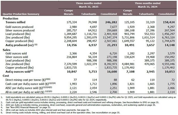 Operating metrics for the Campo Morado and Tahuehueto mines for the first quarter period ended March 31, 2025, are summarized below.