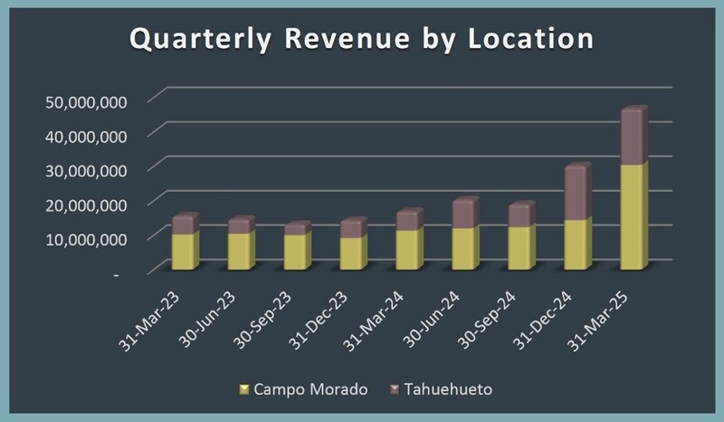 • Strong throughput growth, with a 55% increase in tonnes milled year-over-year to 246,282 tonnes, Campo Morado processed 175,334 tonnes (+40%), while Tahuehueto more than doubled to 70,948 tonnes.