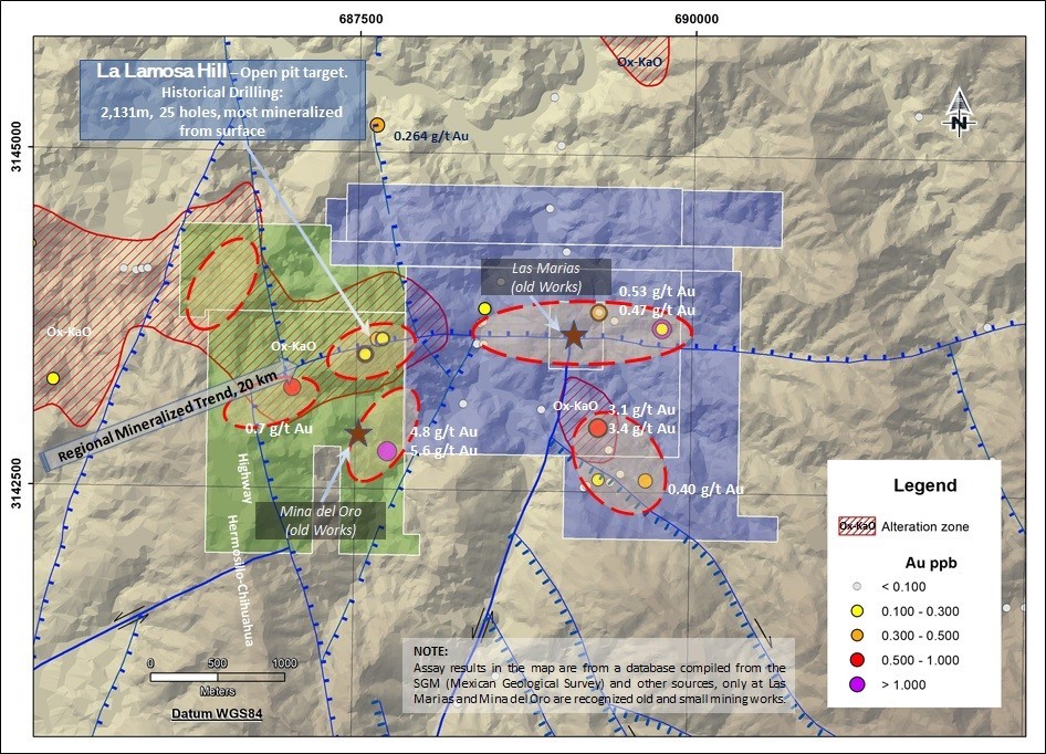 The project is located 43 km from Alamos Gold 3 Moz Mulatos Gold Mine, 40 km from Agnico’s 1 Moz La India Gold Mine, and adjacent to Minera Alamos’ Santana and Santa Rosa projects. Infrastructure and support services are available to the project; paved Federal Highway 16 passes through the western portion of the claims. Electricity, mail, phone services and accommodation are available at the nearby villages of Yecora and Santana. An electrical line (C.F.E.) passes through the property as it parallels the paved highway (fig 1.)
