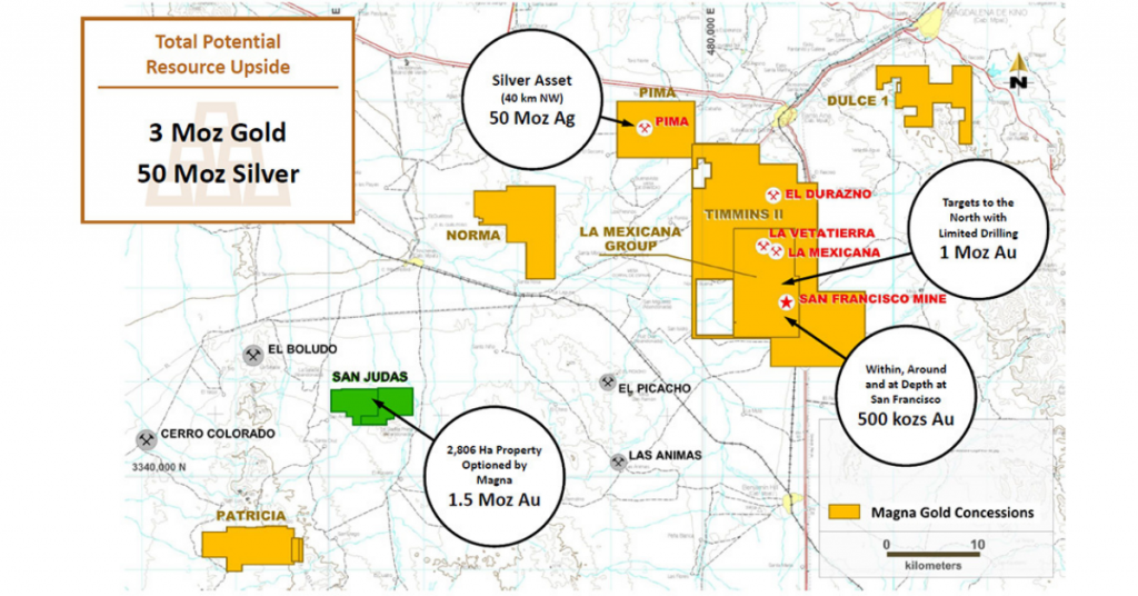 Magna Gold Corp. is a Canadian gold company engaged in operations, development, exploration and acquisitions in Mexico. Magna’s primary asset is the San Francisco gold mine in Sonora, Mexico and exploration stage projects include San Judas, La Pima and Mercedes.