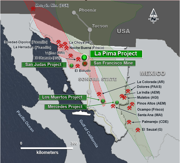 Magna completed a Phase I diamond drill program on the project totalling 1,719 meters in nine core holes. The target is a high-grade silver in replacement deposits hosted in sedimentary rocks. La Pima is in the heart of the Sonora Megashear, which is host to a number gold and silver mines (see Figure 1).