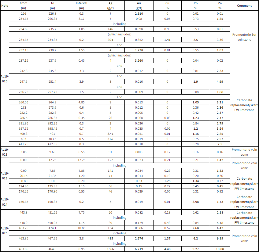 - Hole AL19-025 (250 m northeast of AL19-020): 2.18% Zn and 0.62% Pb over 7.75 m