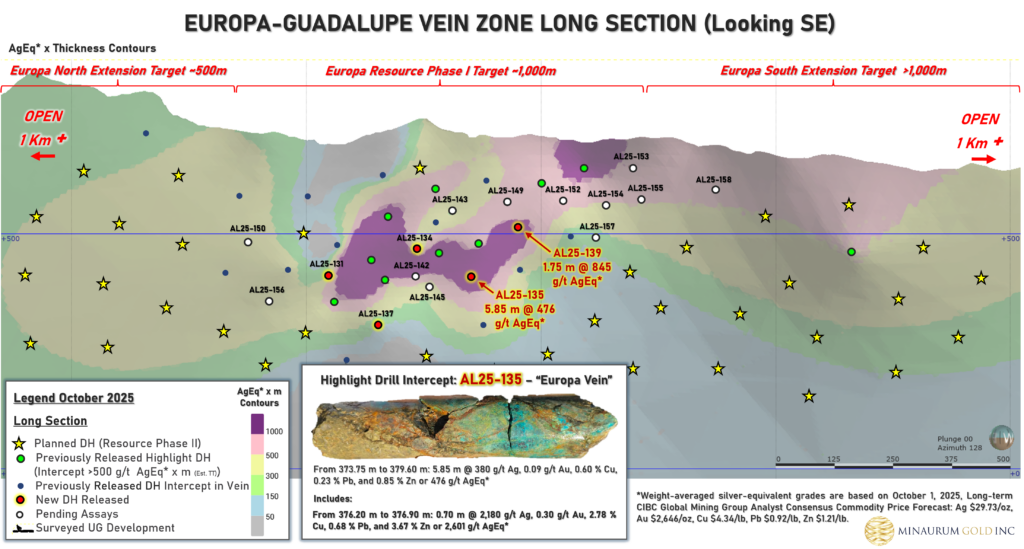 - 5.85 m of 476 g/t silver equivalent (“AgEq”) including 1.80 m of 1,339 g/t AgEq (Hole AL25-135)