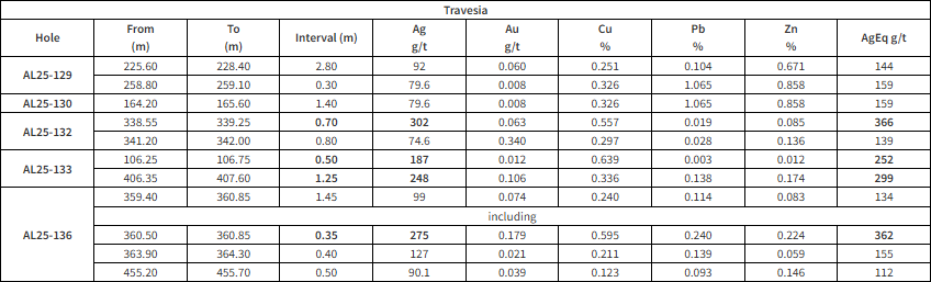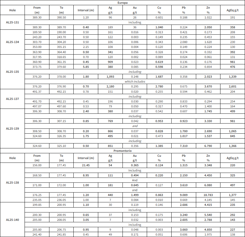 - 21.45 m of 220 g/t AgEq including 1.00 m of 497 g/t AgEq and 1.20 m of 1,377 g/t AgEq (Hole AL25-138)