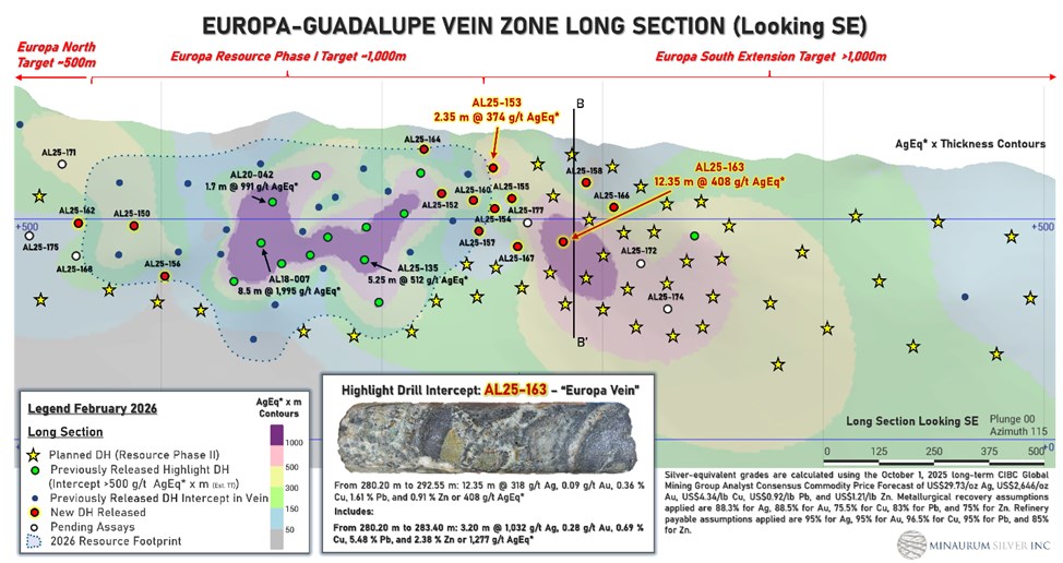 Vancouver, British Columbia–(Newsfile Corp. – February 10, 2026) – Minaurum Silver Inc. (TSXV: MGG) (OTCQX: MMRGF) (“Minaurum”) is pleased to report results from the first holes of its Phase 2, 50,000-meter resource-expansion drill program at the Alamos Silver Project (“Alamos”) in Sonora, Mexico. The program is targeting the Europa, Promontorio, and Travesia vein zones and has returned multiple high-grade silver intersections (Table 1, Figures 1-4).