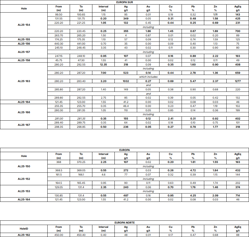 The defined resource of the Europa vein zone occupies about 1 km of its surface-traced 3-km strike length. Recent assay results extend high-grade mineralization along strike, particularly the 1 km extension to the south at Europa. Hole AL25-163 intersected a significant wide interval of 12.35 m zone averaging 408 g/t AgEq, including 3.20 m of 1,277 g/t AgEq (1,032 g/t Ag, 0.278 g/t Au, 0.692% Cu, 5.477% Pb, 2.379% Zn). Hole AL25-154 returned 1.05 m of 231 g/t AgEq, including 0.25 m of 700 g/t AgEq (355 g/t Ag, 1.86 g/t Au, 1.45% Cu, 0.77% Pb, 1.89% Zn) (See Table 1, Figures 2 and 3).
