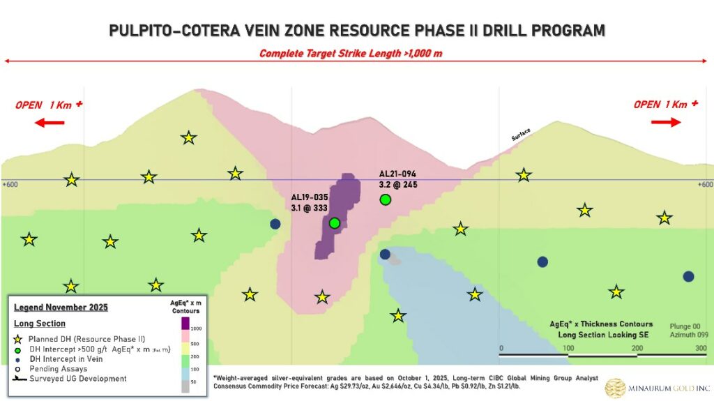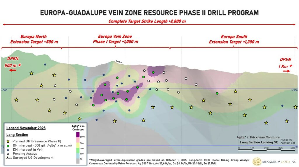 Phase I Drilling targeted three high-grade vein zones — Promontorio, Europa, and Travesia — which will form the basis of the inaugural resource. Initial results have been released and continue to demonstrate continuity of high-grade silver mineralization (see Minaurum news release dated October 16, 2025). Once received, the remaining assays will be incorporated into the resource model in advance of the announcement of the resource estimate.