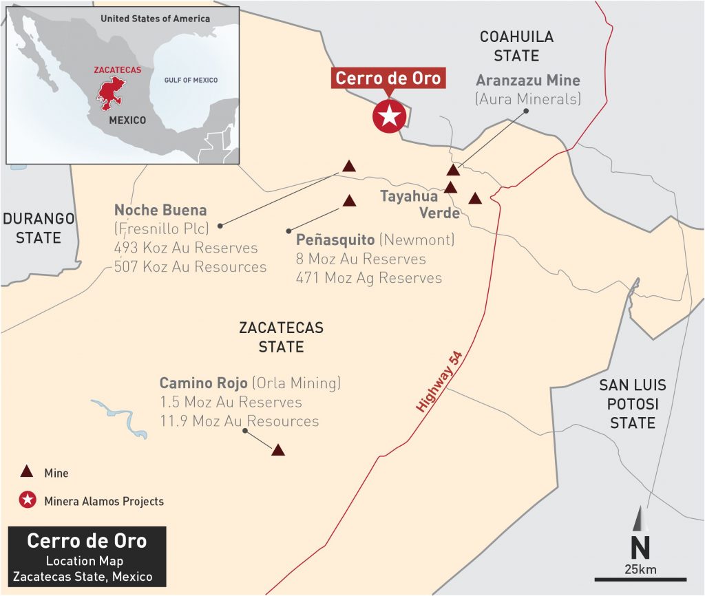 Toronto, Ontario and Vancouver, British Columbia–(Newsfile Corp. – September 15, 2020) – Minera Alamos Inc. (TSXV: MAI) (the “Company” or “Minera Alamos”) is pleased to announce it is continuing to review and compile the remaining historical drill data from the Cerro de Oro gold project in Zacatecas, Mexico (see news release dated August 4th, 2020). The project is located less than 3km from the town of Melchor Ocampo and approximately 30 km from the district’s mining hub at Concepcion del Oro. This area of north-central Mexico is famous for its mineral production, most notably related to gold and silver rich-intrusive-related deposits. Of particular note are a number of nearby large-scale mining operations including Peñasquito (Newmont) just 30km away, Tayahua (Frisco), Noche Buena (Fresnillo) and Camino Rojo (Orla).