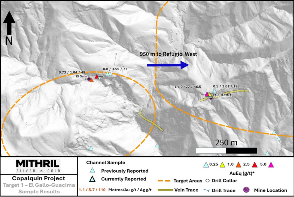 Gold and silver samples from the Guacima Mine and the El Gallo area, located approximately 500 and 950 meters west of mineralized drillholes MTH-RE25-44 and 45, respectively, confirm the presence of additional mineralized structures that extend the broader footprint of the Copalquin system Figure 4.