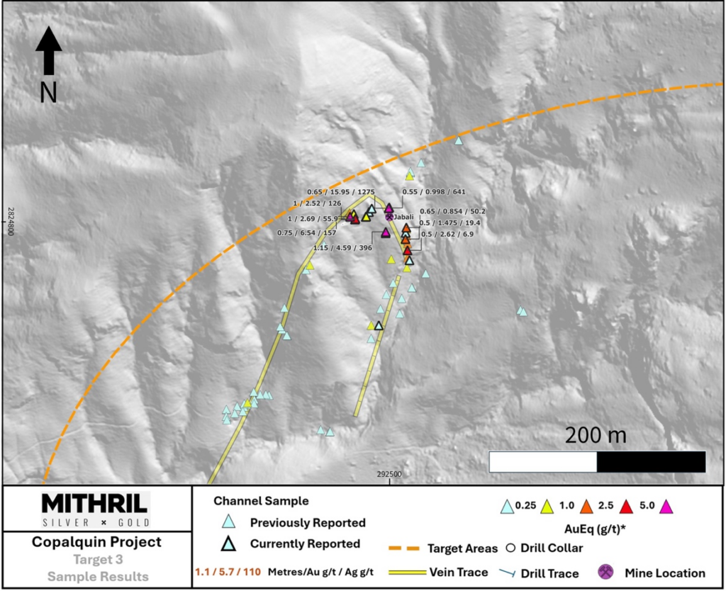 - 0.65 m @ 16.0 g/t gold, 284 g/t silver (Target 3– El Jabali)