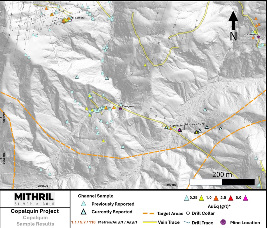 Surface samples collected to the southeast of the Copalquin structure returned grades up to 1 g/t gold and 770 g/t silver. The Copalquin structure, tested to date in the Zaragoza and Copalquin areas, remains open down dip and along strike to both the northwest and southeast. At Zaragoza, drillhole MTH-ZG25-037 intersected 0.57 m grading 6.80 g/t gold and 4,400 g/t silver, an interval interpreted to lie on the same northwest trending Copalquin Structure (Figure 8).
