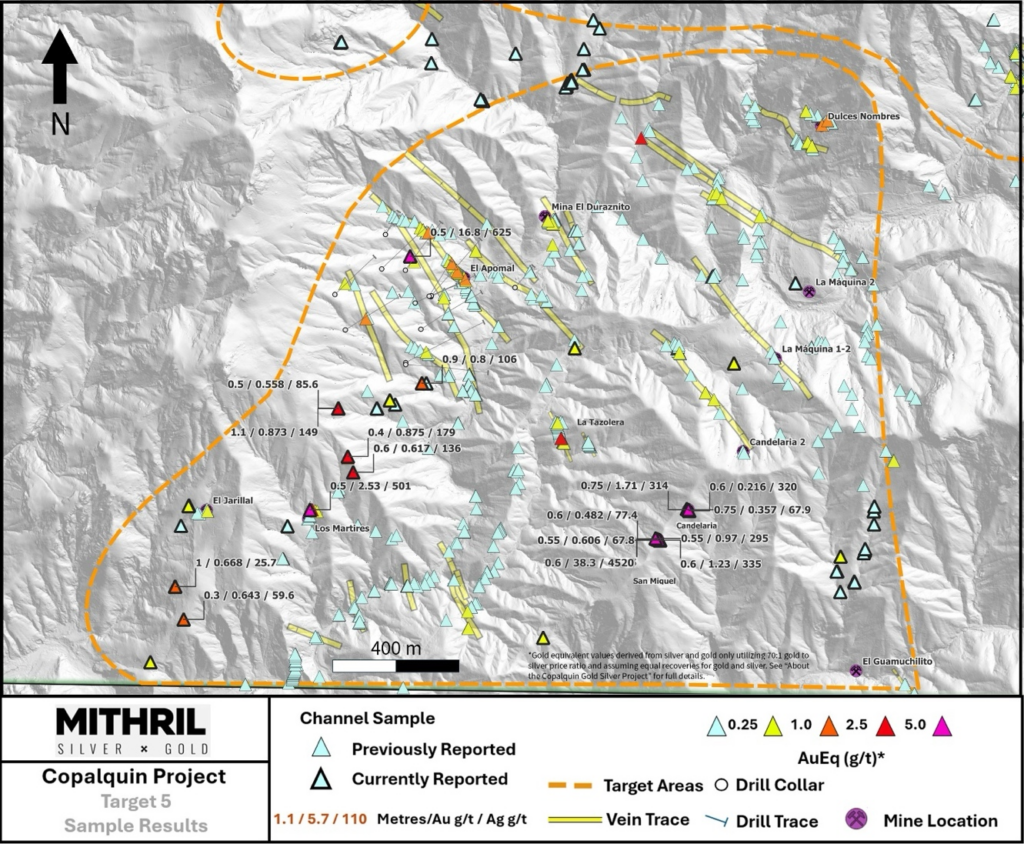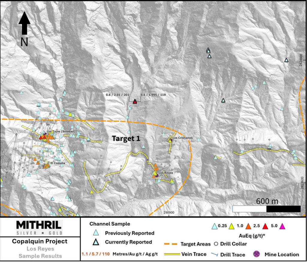 - This work is vectoring into potential feeder zones at Target 1, around Refugio West drill holes MTH-RE25-044 and 045 (7.20 m @ 2.78 g/t gold, 148 g/t silver plus 2.80 m @ 3.97 g/t gold, 208 g/t silver and 8.03 m @ 7.19 g/t gold, 260 g/t silver respectively)1, and around Target 1 Southdrill hole MTH-ZG25-037 (0.57 m @ 6.80 g/t gold and 4,400 g/t silver)2, both of which are interpreted to lie along the same northwest trending structure (the Copalquin Structure).