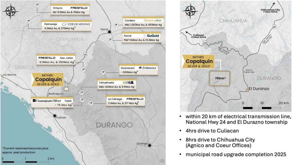 The Copalquin mining district is located in Durango State, Mexico and covers an entire mining district of 70km2 containing several dozen historic gold and silver mines and workings, ten of which had notable production. The district is within the Sierra Madre Gold Silver Trend which extends north-south along the western side of Mexico and hosts many world-class gold and silver deposits.
