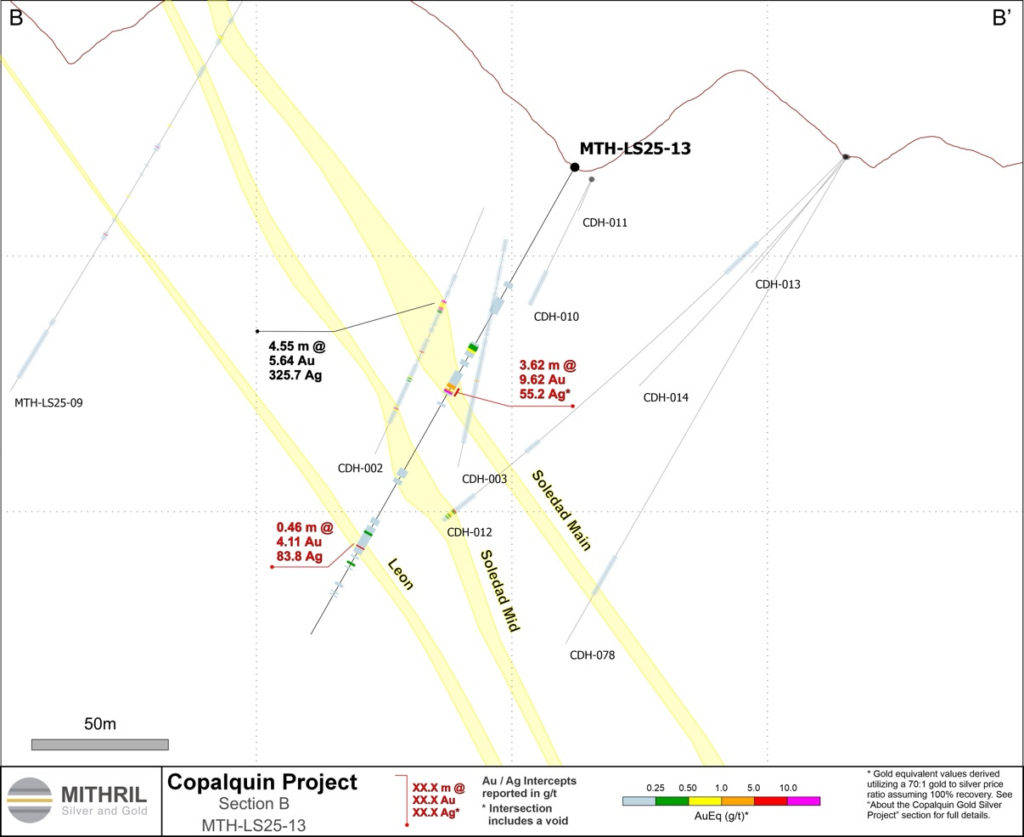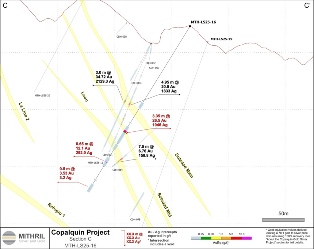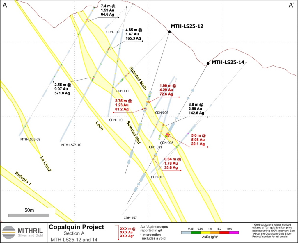 MTH-LS25-14 returned higher AuEq grades than previously estimated in the 2021 MRE along both the Soledad main and Soledad mid veins. The first intercept represents a roughly 20m down-dip extension of high-grade mineralization from CDH-008 and CDH-011 along the Soledad main vein, with the second intercept 42m down-dip from MTH-LS-25-12 and 17m up-dip from CDH-013 along the Soledad mid vein.