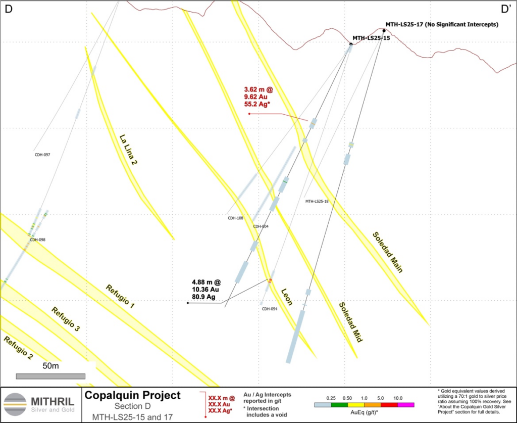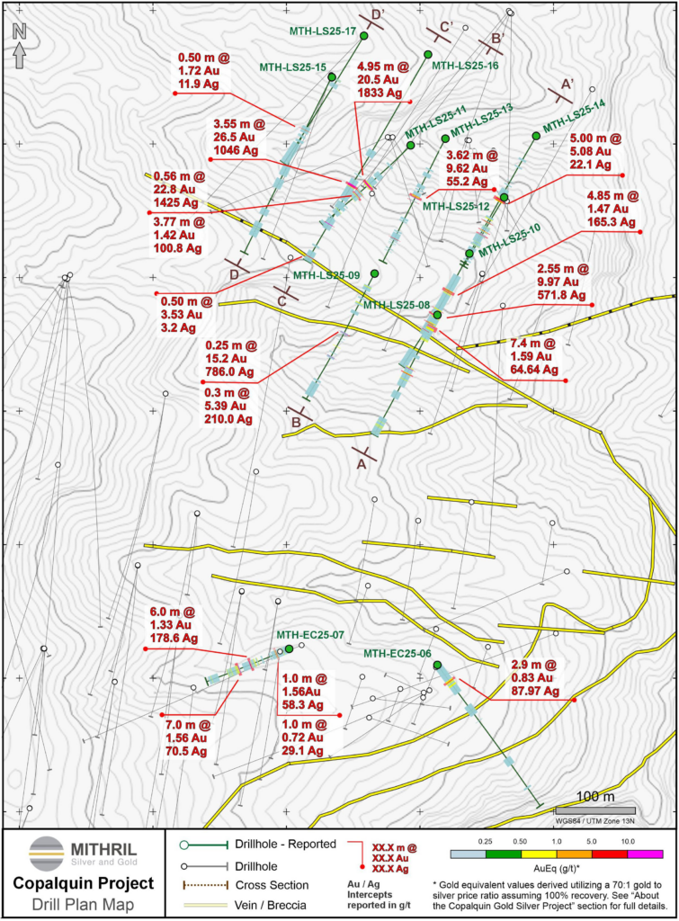 - 0.25m @ 15.2 g/t gold, 786 g/t silver from 98.25m (MTH-LS25-09), plus
