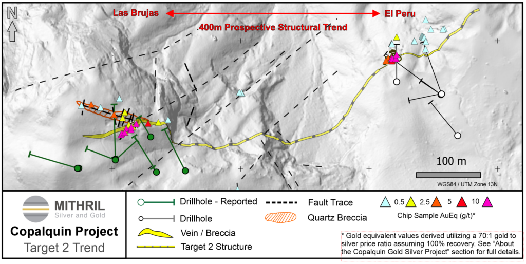 Shallow drilling at the Target 2 prospect (Las Brujas and El Peru) has intersected a mineralized vein system featuring localized breccia zones, banded to colloform quartz, and trace black sulphides. The vein trends east-west with a strike length exceeding 500 metres, dipping approximately 40° to the south. High-grade mineralization in T2DH25-006 is associated with greenish, colloform quartz banding which is present in other Au-Ag epithermal deposits of the Sierra Madre.