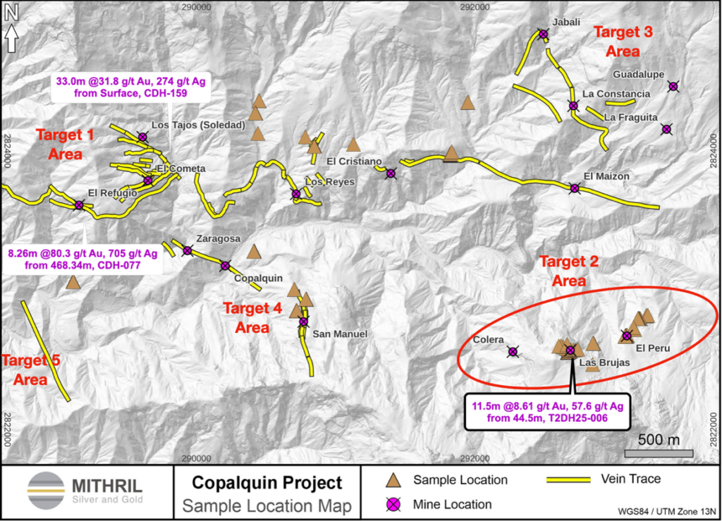 - District-Scale Potential Confirmed: Over 1,000 metres of vertical relief between Target 2 and Target 5 across 5 km demonstrates the immense scale and structural complexity of the Copalquin district, underscoring its potential to host a large, multi-target mineralized system.