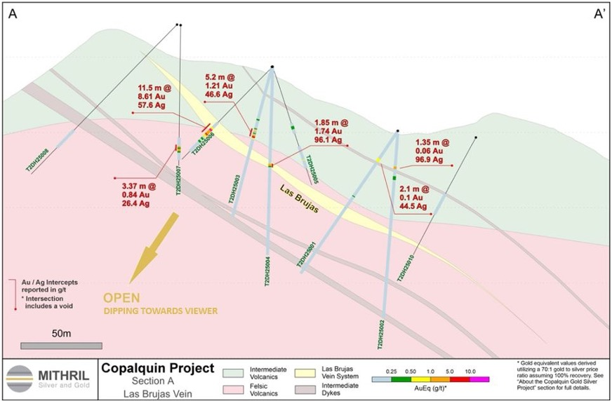 - 11.5m @ 8.61 g/t gold, 57.6 g/t silver from 44.5m,(T2DH25-006)2, including