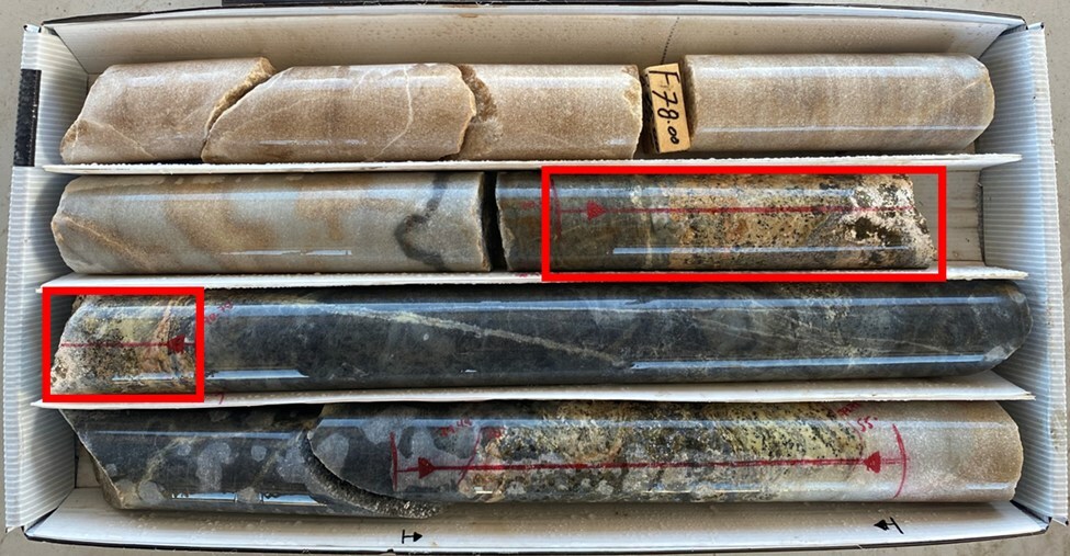 Figure 2. Eudialyte in a vein between 78.46 and 78.78 m below ground surface in drill hole JV-23-01 (interval denoted in red boxes). (CNW Group/Monumental Minerals Corp.)