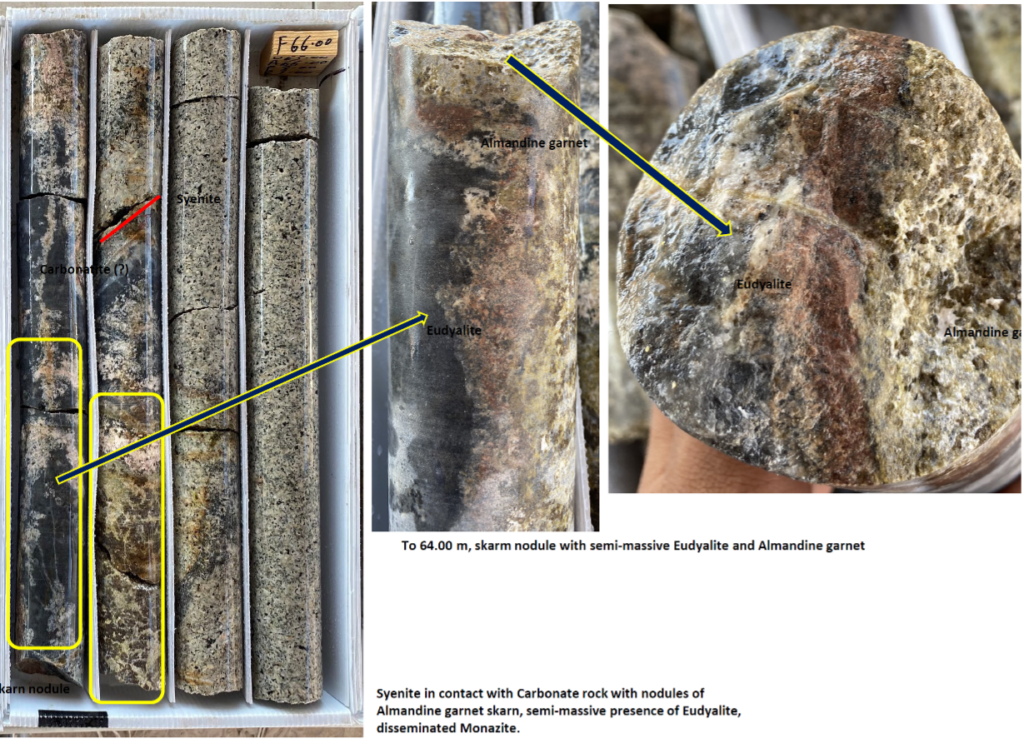 Numerous intrusive peralkaline dykes, sills, and veins, with identifiable eudialyte (Figure 1) were intersected in the completed holes. Eudialyte is the mineral that is most commonly associated with REEs at Jemi. These peralkaline dykes and sills tend to occur in structural zones that appear to be adjacent to larger bodies of syenitic intrusions and are associated with irregular skarn mineralization at the contacts with the host carbonate sedimentary rocks. These zones are as much as several tens of meters in width downhole. The syenite may be the feeders for the peralkaline features (parental rocks) and pegmatitic intrusive rocks. Light rare earth element (LREE) bearing minerals such as monazite and xenotime have also been identified by visual inspection.