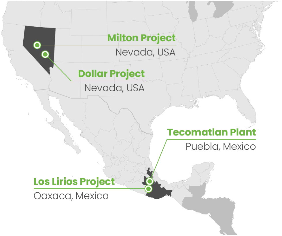 - Los Lirios Antimony Project (Mexico): Our flagship, high-grade project. We are fast-tracking Los Lirios to production, with Tecomatlán plant just 50km away.