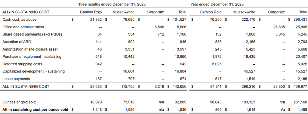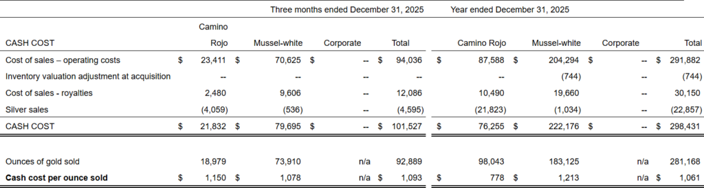 The Camino Rojo Oxide Gold Mine produced 19,587 ounces of gold in the fourth quarter of 2025.