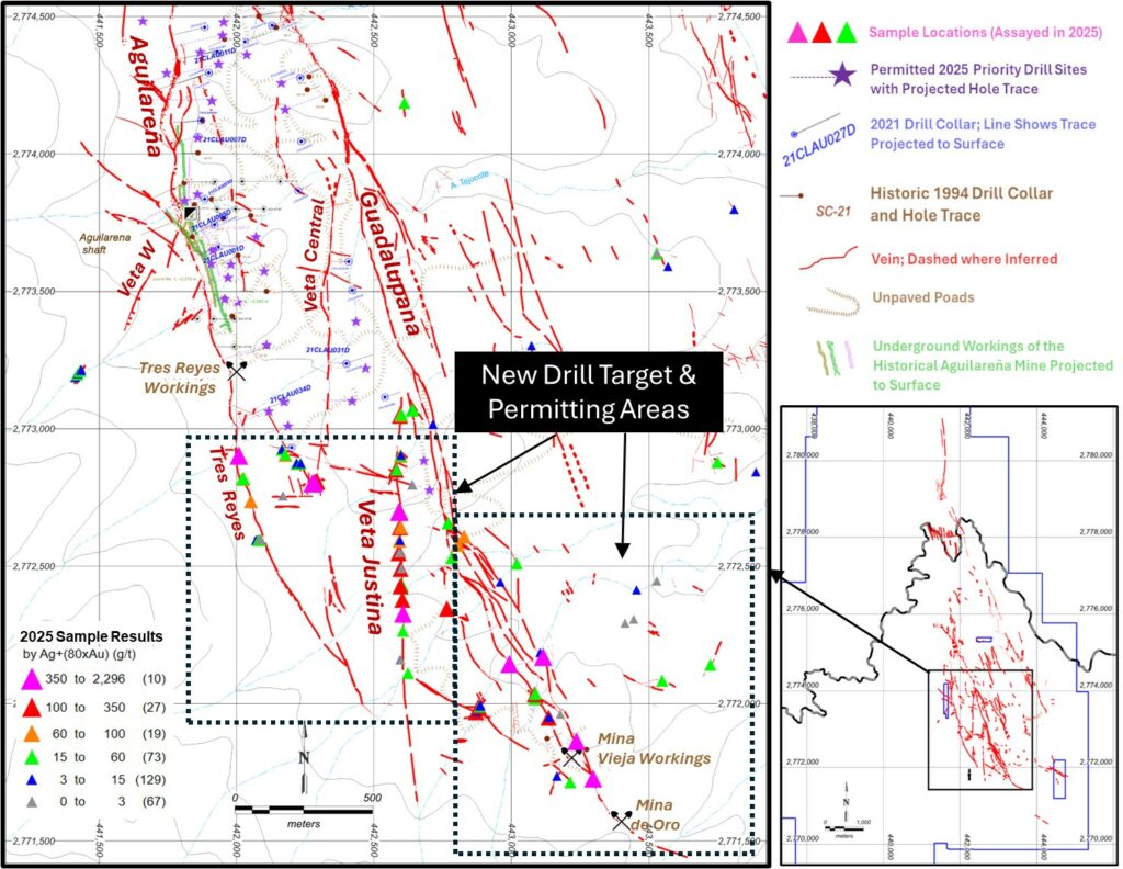 “In addition, the highest single sample assay result of 22.7 g/t Au and 480 g/t Ag was collected from the southernmost area sampled, which suggests that mineralization may extend further south for another 300 metres towards the Mina de Oro vein system. These results highlight the significant scale and potential of the precious metals systems at the project, which we are keen to prove up through drilling. We expect to have permits in hand to drill these new high-priority targets in Q1 2026,” concluded Mr. Anthony.