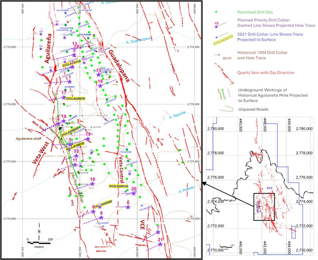 First, drilling is planned to step out from the best intercepts encountered from 2021 drilling carried out by Durango Gold (see yellow highlighted labels in Figure 2). These include Hole 21CLAU011D, which intersected 9.15 metres at an average of 688 g/t silver equivalent (AgEq calculated using an 80:1 silver-to-gold ratio), from 157.75 metres, including 3.15 metres of 1,352 g/t AgEq; and Hole 21CLAU34D, which intersected 4.15 metres of 554 g/t AgEq from 140.8 metres, including 0.55 metres of 1,955 g/t AgEq (see Table 1). Priority holes are also planned to potentially expand the fully open Veta Central mineralization discovered in 2021 with hole 21CLAU31D that returned 6.05 metres of 192 g/t AgEq from 62.1 metres, including 1.0 metre of 437 g/t AgEq.