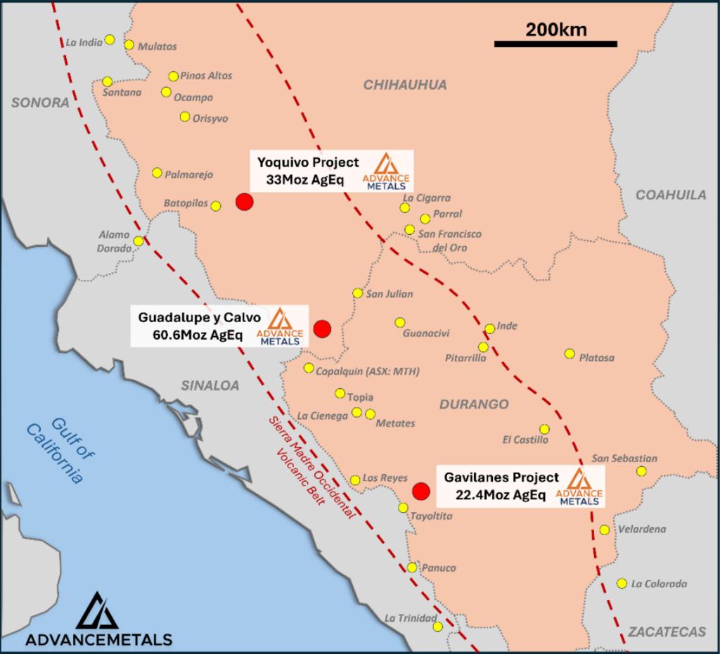 Advance Metals announced a maiden JORC (2012) mineral resource of 33Moz silver equivalent at its Yoquivo project in Chihuahua, confirming a large-scale silver-gold system. The resource totals 8.8Mt at 120 g/t AgEq, including 23Moz silver and 140koz gold, with broad, shallow mineralization supporting potential bulk mining and further expansion through ongoing drilling.