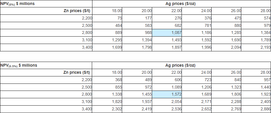 The following tables provide sensitivities for NPV(8%) and NPV(6.5%) at various silver and zinc prices and based on a production capacity of 50,000 tpd.