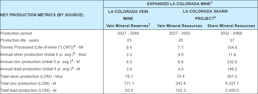The existing La Colorada vein mine will continue operating during the construction, commissioning and well into the operation of the La Colorada Skarn Project; however, its associated mineral reserves scheduled to be mined during the life-of-mine were excluded from the Revised PEA mine plan and economics for the La Colorada Skarn Project and therefore do not contribute to the following highlights for the La Colorada Skarn Project.