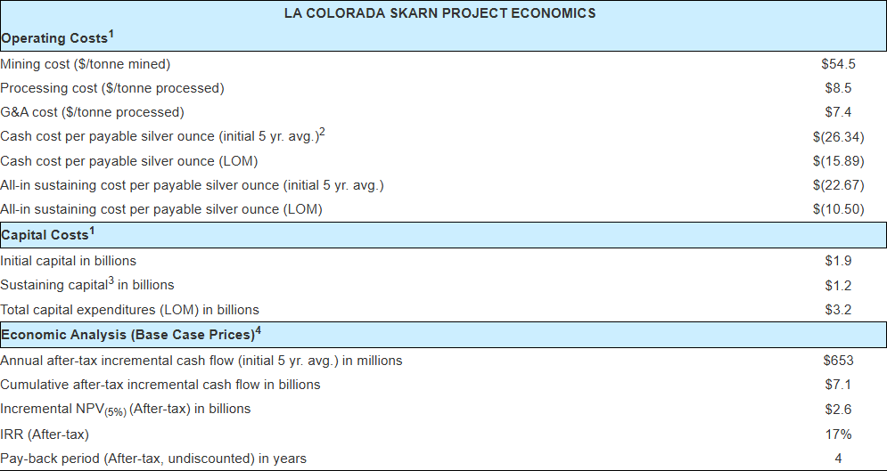 • Attractive project returns: after-tax net present value (“NPV”) (5%) of $2.6 billion with an after-tax internal rate of return (“IRR”) of 17% (the “Base Case Scenario”), which is incremental to the current La Colorada mine mineral reserve economics, and using long-term metal prices of $45.00 per ounce of silver, $2,800 per tonne of zinc and $2,000 per tonne of lead (the “Base Case Prices”). At increased prices of $75.00 per ounce of silver, $3,400 per tonne of zinc, and $2,000 per tonne of lead (the “Upside Price Scenario”), the La Colorada Skarn Project after-tax NPV (5%) is $5.2 billion and the after-tax IRR is 25%.