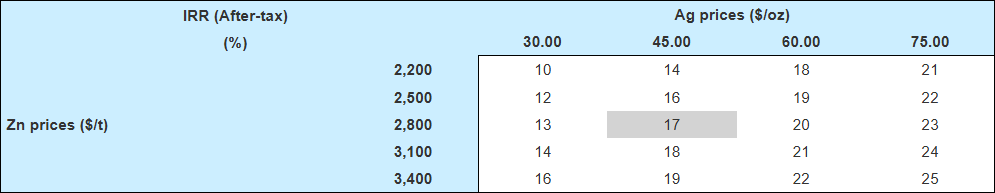 The following tables provide La Colorada Skarn Project economic sensitivities for incremental NPV (5%) and IRR at various silver and zinc prices.