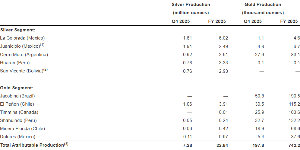 - Attributable silver production of 22.8 million ounces exceeded the updated annual guidance range, with a record 7.3 million ounces produced in Q4 2025(1)(2).