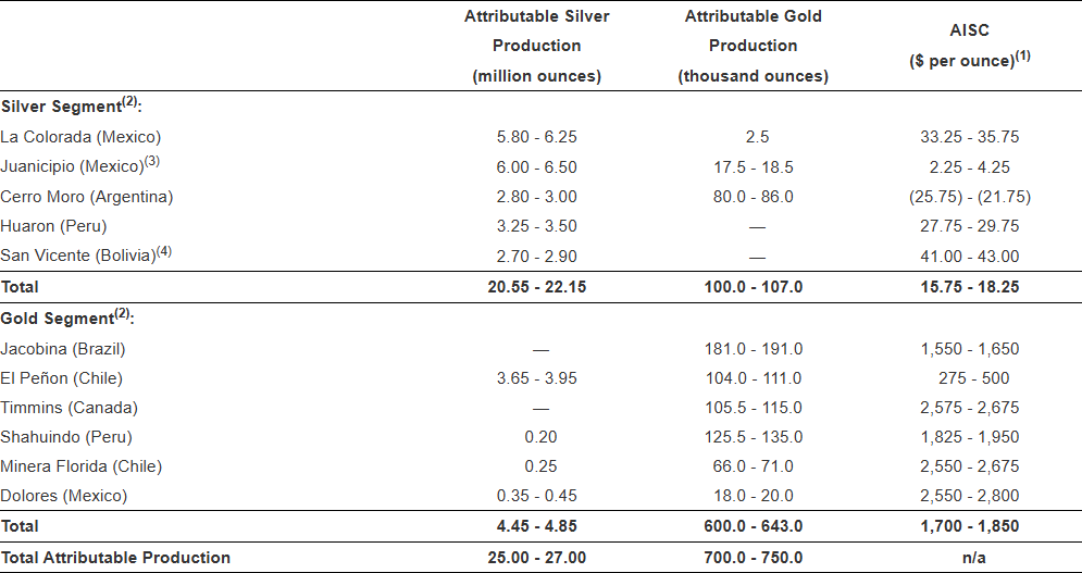 - Silver Segment all-in sustaining costs (“AISC”)(4) are expected to be between $15.75 and $18.25 per ounce.