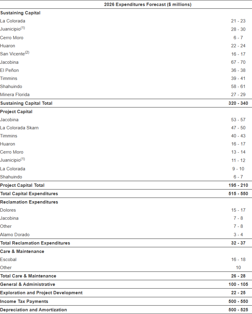 - Jacobina – scheduled plant maintenance in the third quarter of 2026; increased operating costs from additional development and higher hauling contract rates, and higher sustaining capital spending on mine equipment and plant upgrades.