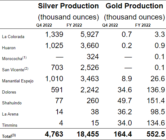- Consolidated silver production in 2022 of 18.5 million ounces was within the revised guidance range of 18.0 to 18.5 million ounces provided on November 9, 2022, and only modestly below the original guidance of 19.0 to 20.5 million ounces provided on February 23, 2022.
