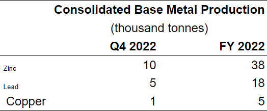 - Consolidated zinc production in 2022 of approximately 38 thousand tonnes was within guidance of 35 – 40 thousand tonnes, lead production of approximately 18 thousand tonnes was above guidance of 15 – 17 thousand tonnes, and copper production of approximately 5 thousand tonnes was modestly below guidance of 5.5 – 6.5 thousand tonnes, based on the original guidance ranges provided on February 23, 2022.